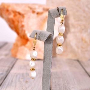 עגילים המשלבים חרוזים דמוי פנינה וחרוזים בציפוי זהב 24 קראט בגימור מט.