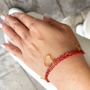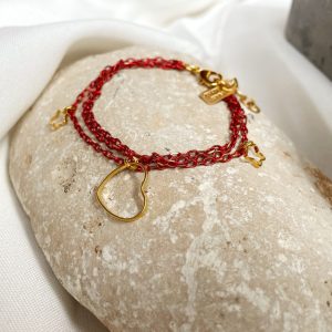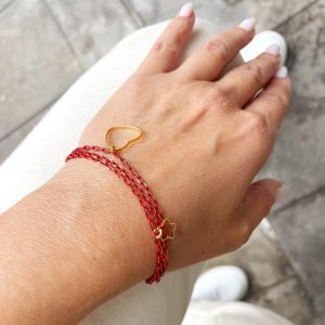צמיד מתלפף בשילוב צבעים משגע- אדום וזהב בצמיד אלמנטים של לב וכוכבים חלולים בציפוי זהב. מושלם להוסיף לצמידים נוספים.