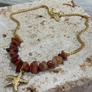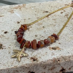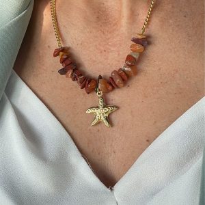 שרשרת אבנים בגוונים חום-כתמתם עם תליון כוכב ים גדול בציפוי זהב איכותי