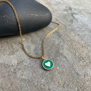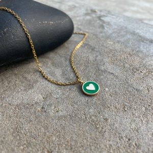 עם תליון עגול בגוון ירוק עמוק ובתוכו לב זהב